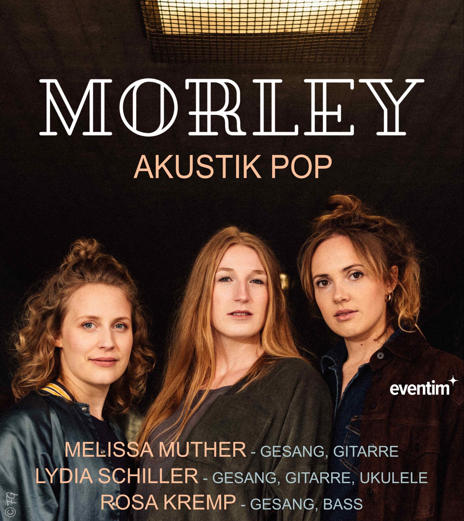 MORLEY spielen zeitlosen Akustik-Pop. Dreistimmiger Gesang, der mal kraftvoll und energetisch, mal zerbrechlich und raffiniert anmutet. Feinfühlig begleitet von diversen Saiteninstrumenten. Die drei Sängerinnen und Songwriterinnen Melissa Muther, Lydia Schiller und Rosa Kremp aus Köln und Essen erschaffen zusammen eine Musik, die durch ihre Klarheit, Reinheit und Seele direkt ins Herz geht.