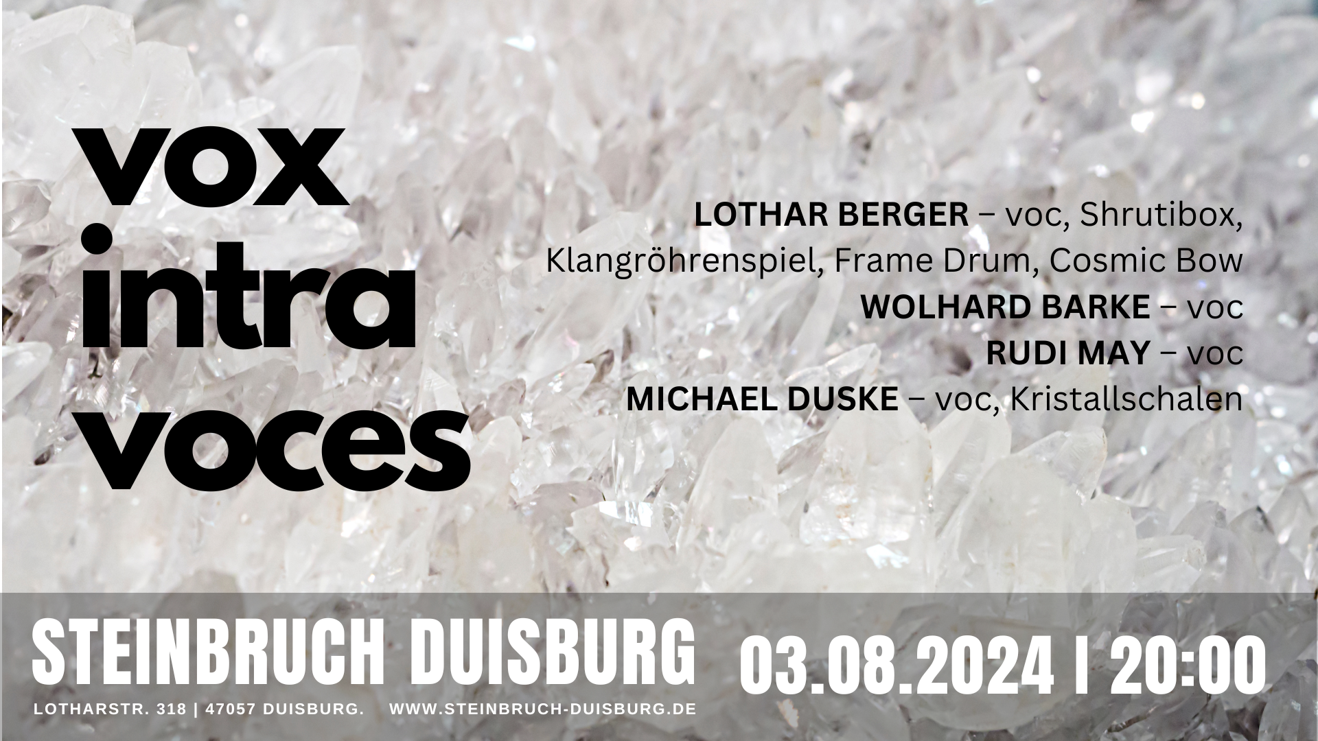 Die vier improvisationserfahrenen Obertonsänger aus dem Rheinland, allesamt Mitglied im Obertonchor unter Leitung von Lothar Berger, lassen sich bei diesem Konzert auf Impulse aus dem Nichts und auf den Klang obertonreicher Instrumente ein. Frank Preuß begleitet als Gastmusiker mit der akustischen Gitarre.