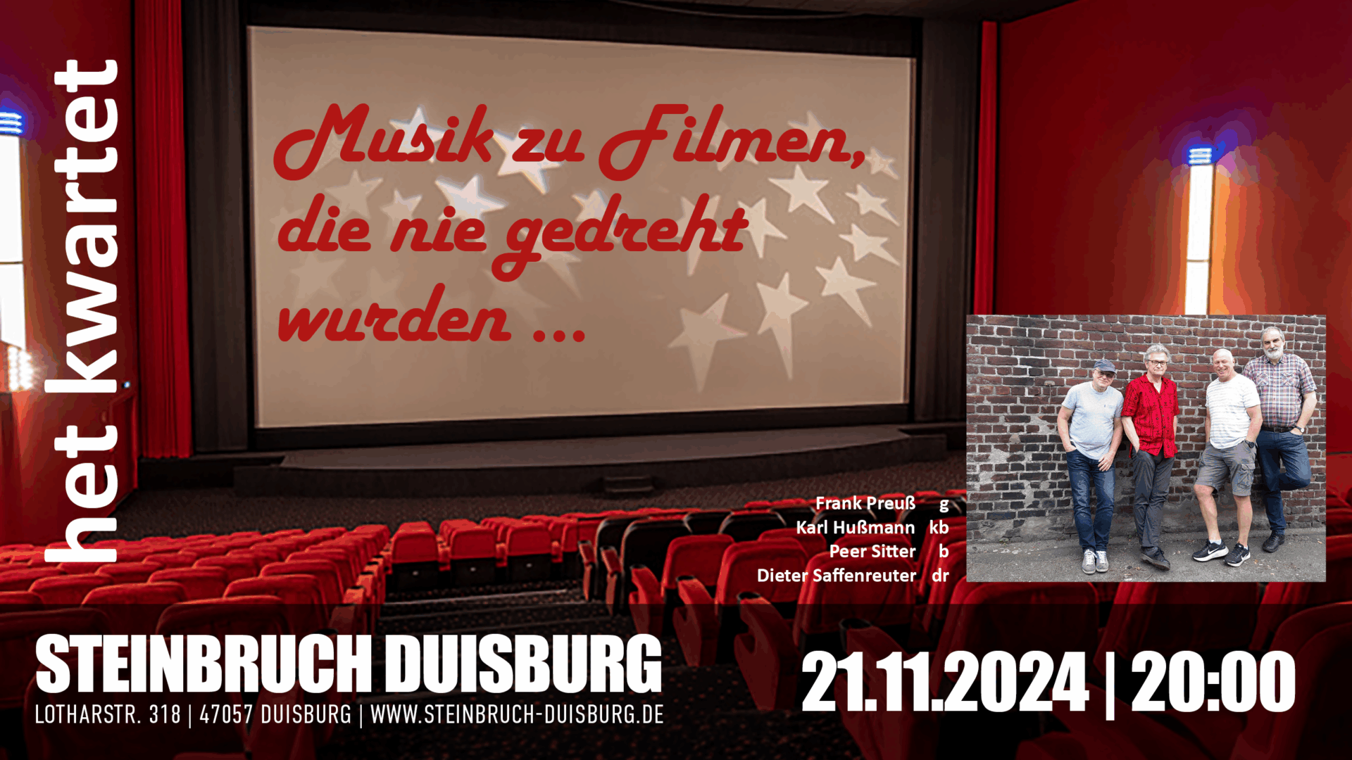 Man nehme eine große Portion Progrock und eine fast genauso große Menge Jazz, würze mit ein bisschen klassischem Rock, etwas Fusion und einer Prise Humor und Gelassenheit: Fertig ist der Mix von „het kwartet“. Die vier nicht mehr ganz taufrischen, aber immer noch frechen Jungs nennen es „Musik zu Filmen, die nie gedreht wurden“. Damit ganz individuelle Bilder in den Köpfen der Zuhörenden entstehen, gibt es keinen Gesang, aber ansonsten die klassische Rockbesetzung mit Gitarre (Frank Preuß), Bass (Peer Sitter), Keyboards (Karl Hußmann) und Drums (Dieter Saffenreuter).