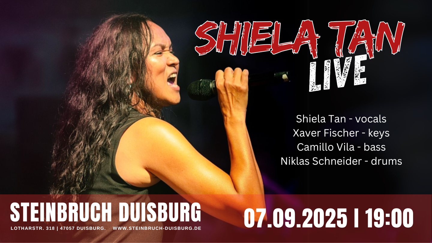Sie überzeugt ihr Publikum durch ihre kraftvolle Stimme in den Bereichen Soul, Rock, Jazz und Elektropop. Ausgestattet mit einem beeindruckenden Repertoire, trat sie bereits mit unterschiedlichen Formationen auf allen Kontinenten der Welt auf. Jahrelang tourte Shiela Tan mit ihrer Band durch China, Mexiko, USA und Europa.