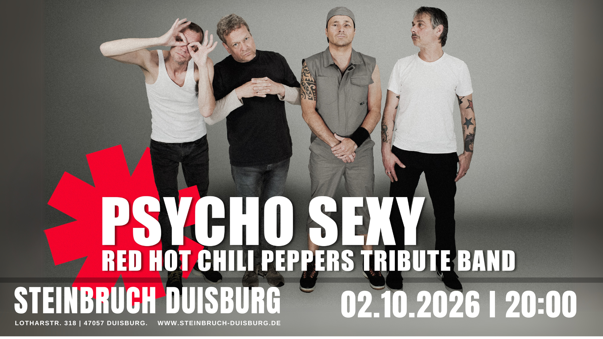 Seit 2003 erspielt sich die Red Hot Chili Peppers Tribute Band „Psycho Sexy“ immer mehr Fans in ganz Europa. Schweißtreibend, energiegeladen und mit nie endender Spielfreude rockt und funkt sich das Quartett aus dem Rheinland buchstäblich die Finger blutig. Dabei sind die vier Vollblutmusiker jederzeit in der Lage eine Live-Atmosphäre zu kreieren, die die Grenzen zwischen Original und Kopie fast komplett verwischt.